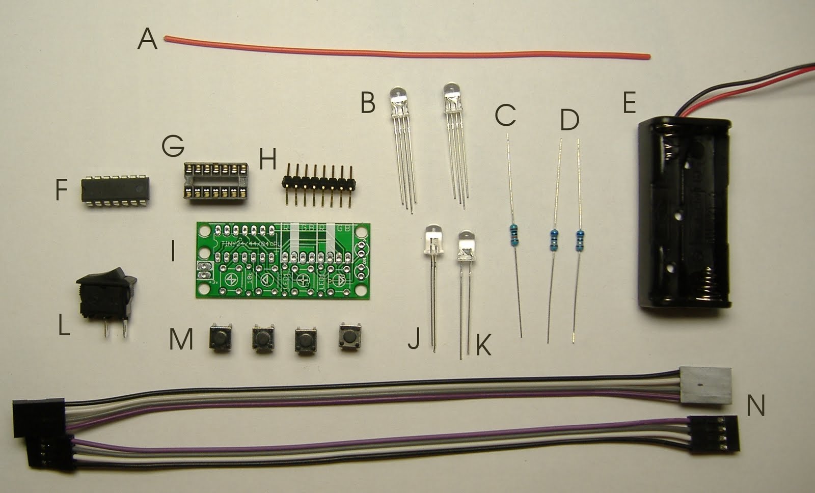 Next, we are going to wire up and place the red, green, and blue (RGB) LEDs which generate the flickering light pattern.